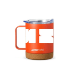 Caneca Térmica de 400ml feita em inox com fundo de cortiça, tampa com bocal e trava de segurança.